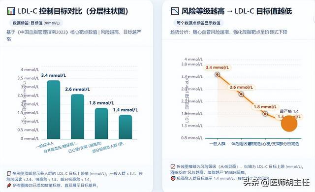 严格结束血脂中枢宗旨,低密度脂卵白胆固醇(LDL-C),《中国血脂科罚指南(2023年)》明确把LDL-C 算作要紧扰乱靶点,一般成年东说念主最佳结束在3.4 mmol/L 以下;要是统一高血压、糖尿病或抽烟等危急要素,方向要更严,降到2.6mmol/L 以下;要是已全心梗、作念过支架,属于很高危,时常要降到1.8 mmol/L以下,部分极高危东说念主群还要更低。