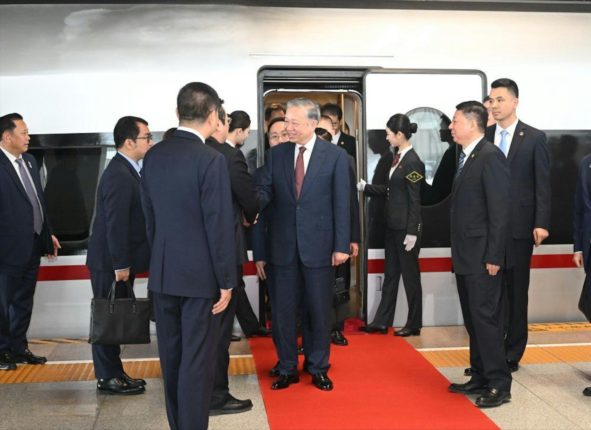 此次越南高层访华,临了的完毕花式很不寻常,莫得按成例坐专机径直归国,而是先坐中国高铁到广西边境,再换乘跨境列车回越南。